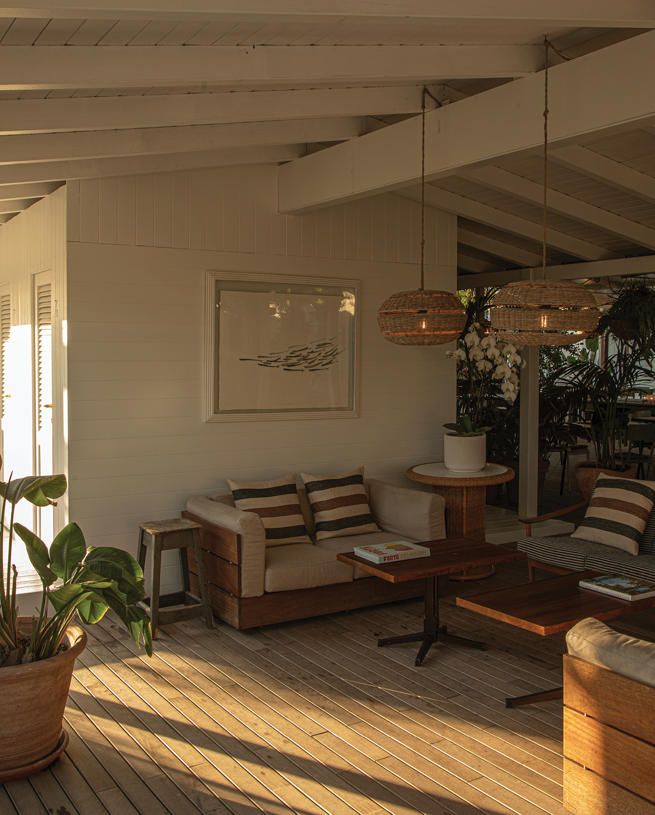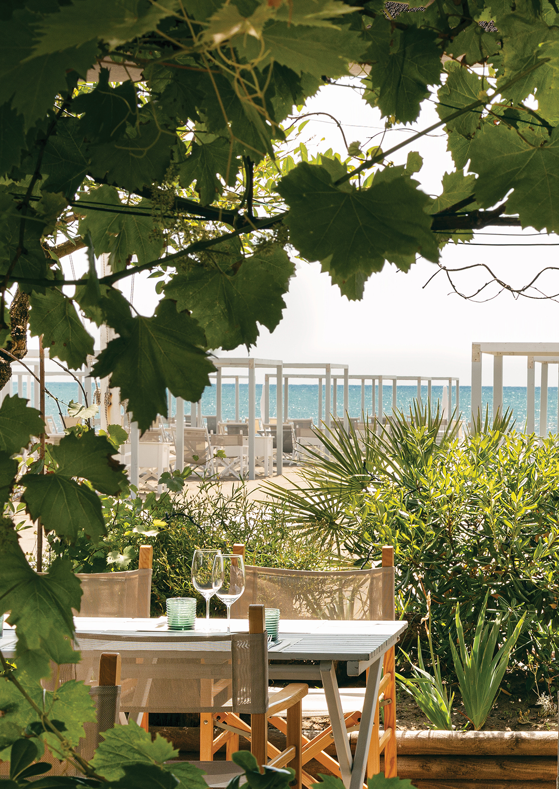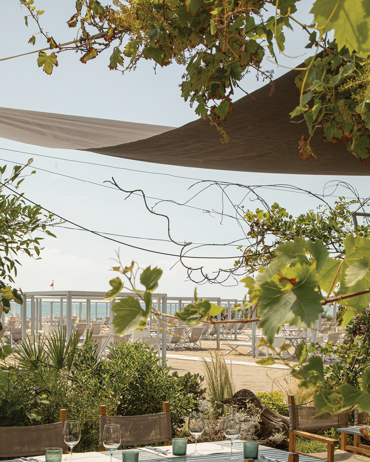 La nostra veranda offre uno scenario unico e piacevole: circondata dal verde si affaccia sulla spiaggia con il suo ritmo ordinato di tende bianche ed il mare all’orizzonte. Il design ricercato crea un'atmosfera raffinata ma al tempo stesso accogliente, ideale per degustare le nostre specialità a pranzo e a cena.